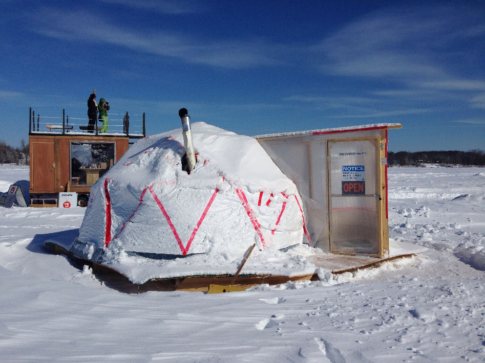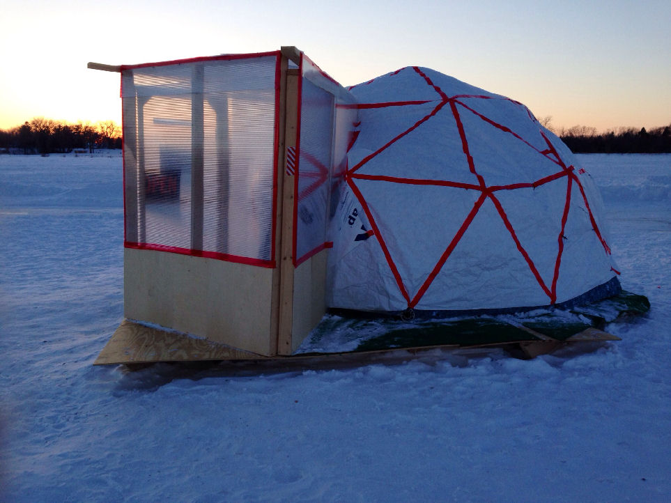 Here is a picture of our dome on a frozen lake. We built a greenhouse onto the front of it and constructed a shell made from a layer of recycled denim insulation and Tyvek. The dome was easy to assemble and we were really pleased with it.