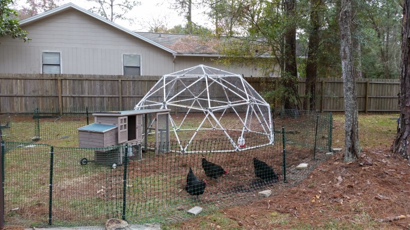 Here's a picture of my dome. As you can see, Penny, Amy and Bernadette, my 3 Black Australorps, are quite happy. I modified one of the panels to attach their tractor and I move this around the yard about once a month so they have plenty of fresh grass. I live in an urban area. The conditions of the "chicken permit" require the chickens be entirely enclosed at all times, so the dome was the perfect answer!