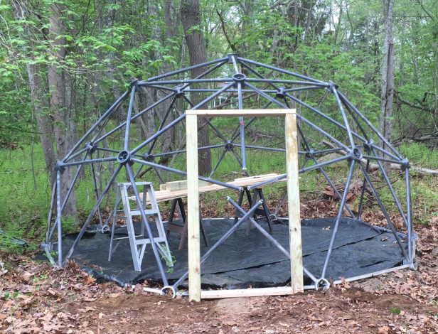Your dome doors, as shown in the video, might be good for squeezing in and out, if you're a child or you rarely access the dome. It was not a good solution for storage of snowblowers, etc. After some consultation with my more clever friends, we sunk 4 x 4s in concrete at the angle of the slant of the dome and used 2 x 4 for the threshold and the lintel. I cut the five PVC struts to size, redrilled holes, and sunk eye bolts in the 4 x 4 door frame lumber, and then secured the PVC struts with zip ties through the eye bolts to keep the shape and for structural support.